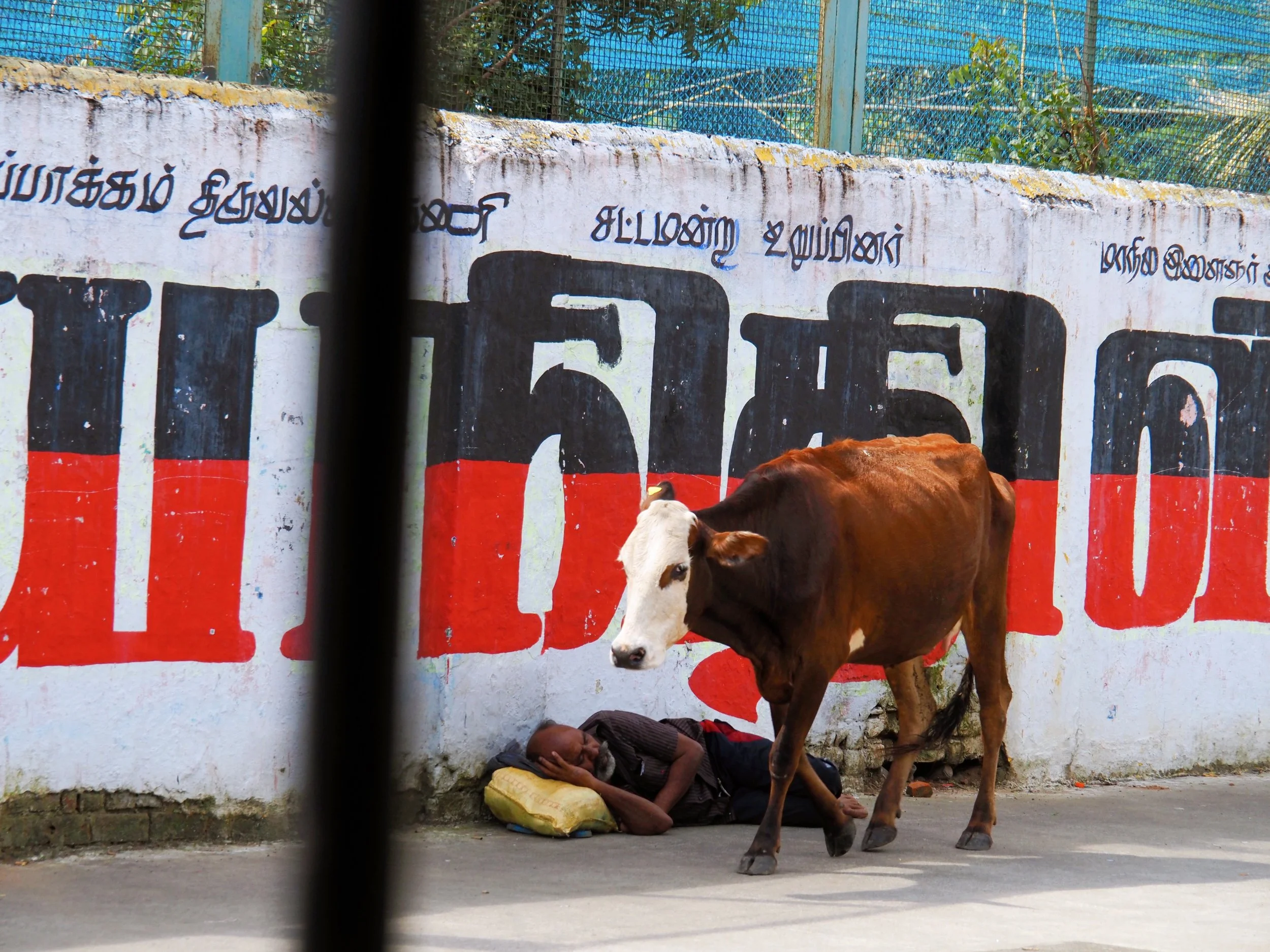 It’s a dog-eat-dog world out there on the streets of India. As I was zipping through the city in an auto rickshaw, I saw this skinny cow wandering down a sidewalk past a sleeping man on a hot & humid December day.
