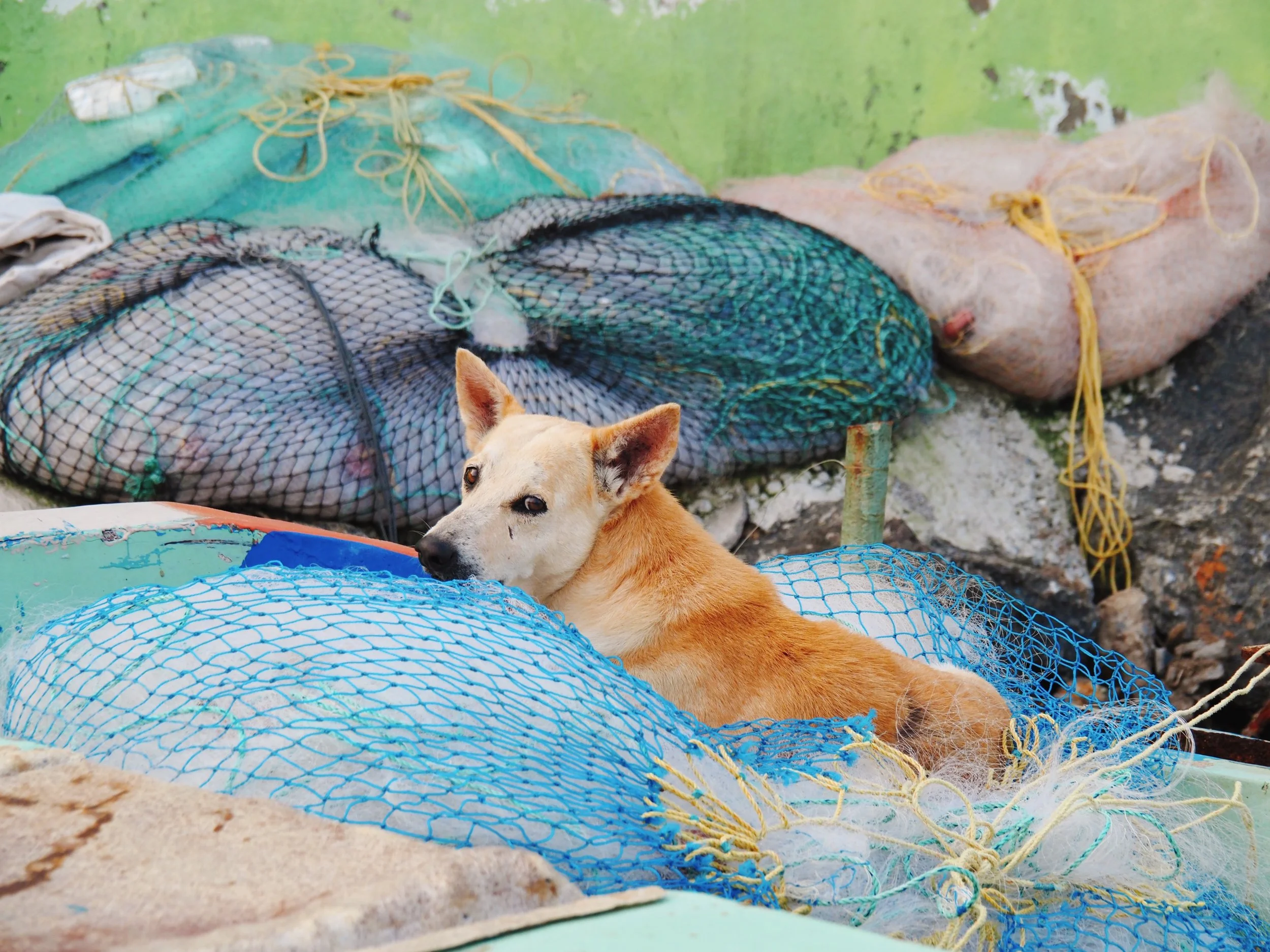 A bed of light fluffy fish nets? Count me in. This dog found quite the spot inside a fisherman’s boat in the beach town of Mamallapuram, Tamil Nadu. He finally caught on to the fact that I had been manically photographing him.